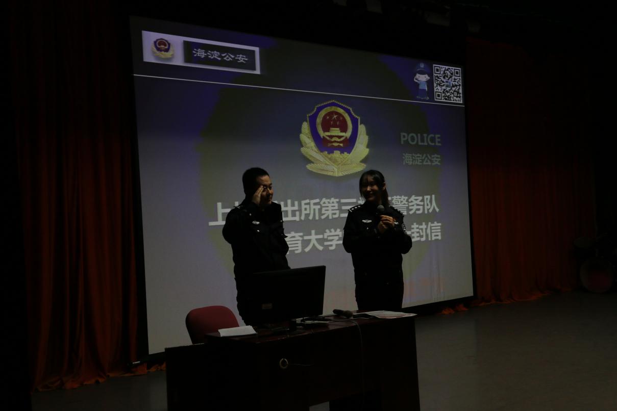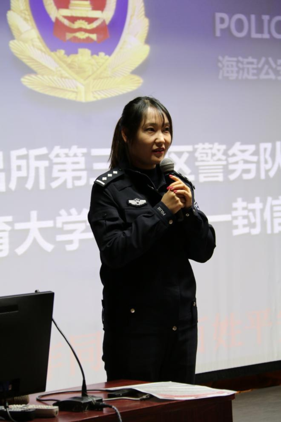 张艺曼警官向同学们介绍上地派出所副所长王浩洋