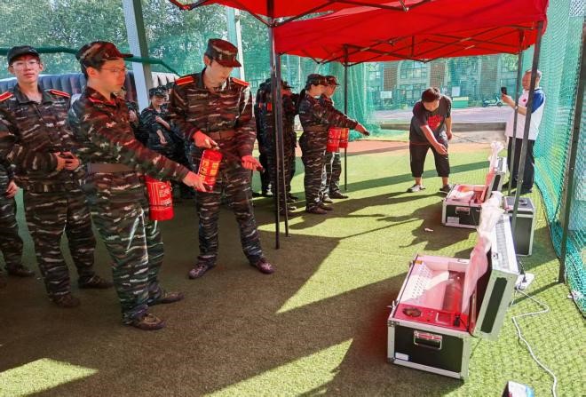 在灭火器实操区,教员示范手提式干粉灭火器 “提、拔、握、压” 四步使用法,详细讲解操作过程中的安全注意事项(如保持安全距离、对准火焰根部喷射等);随后,新生们以班级为单位依次上前实操,保卫部老师在旁逐一指导,及时纠正操作偏差,直至每位新生都能规范完成灭火器使用流程。
