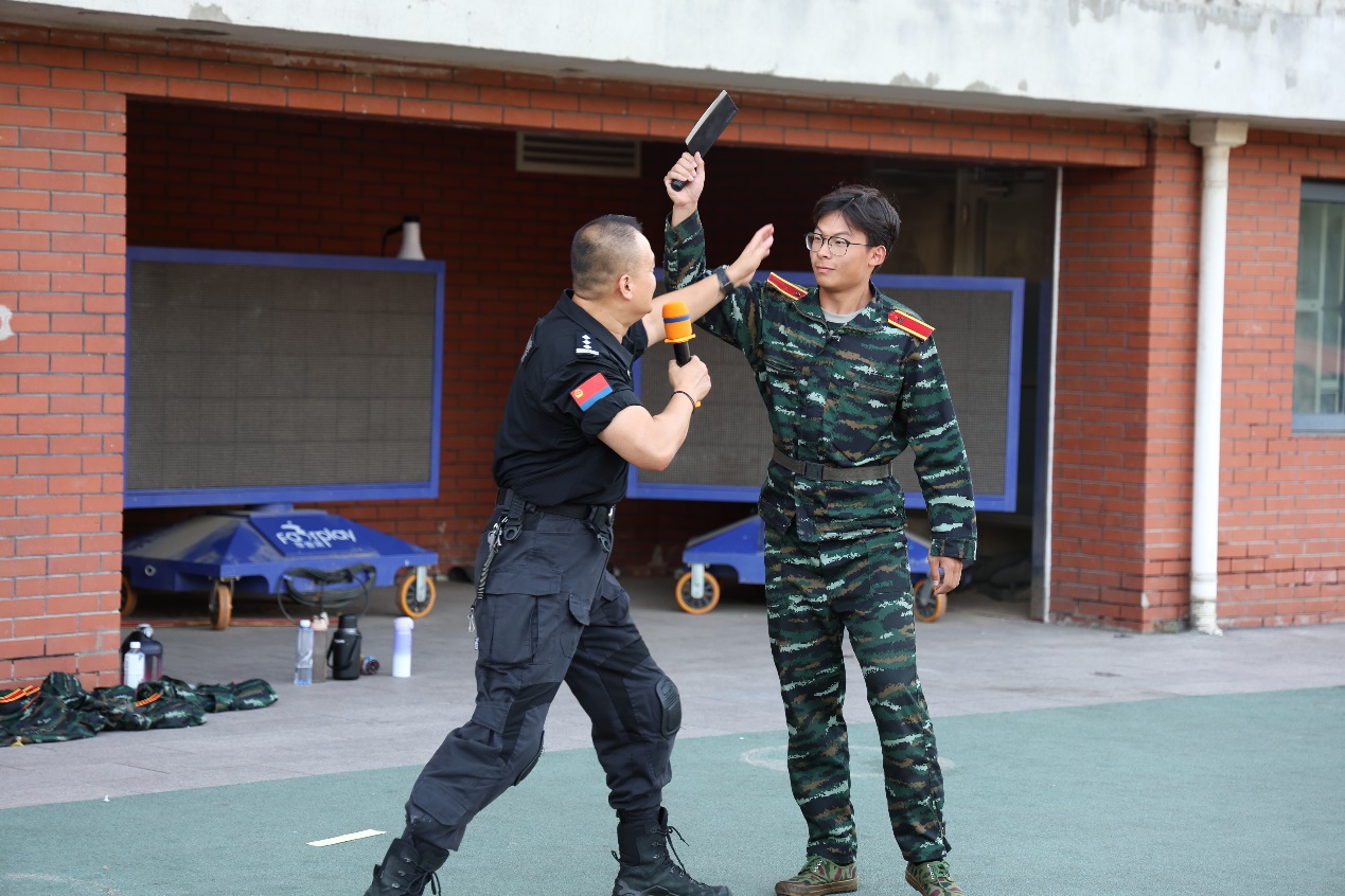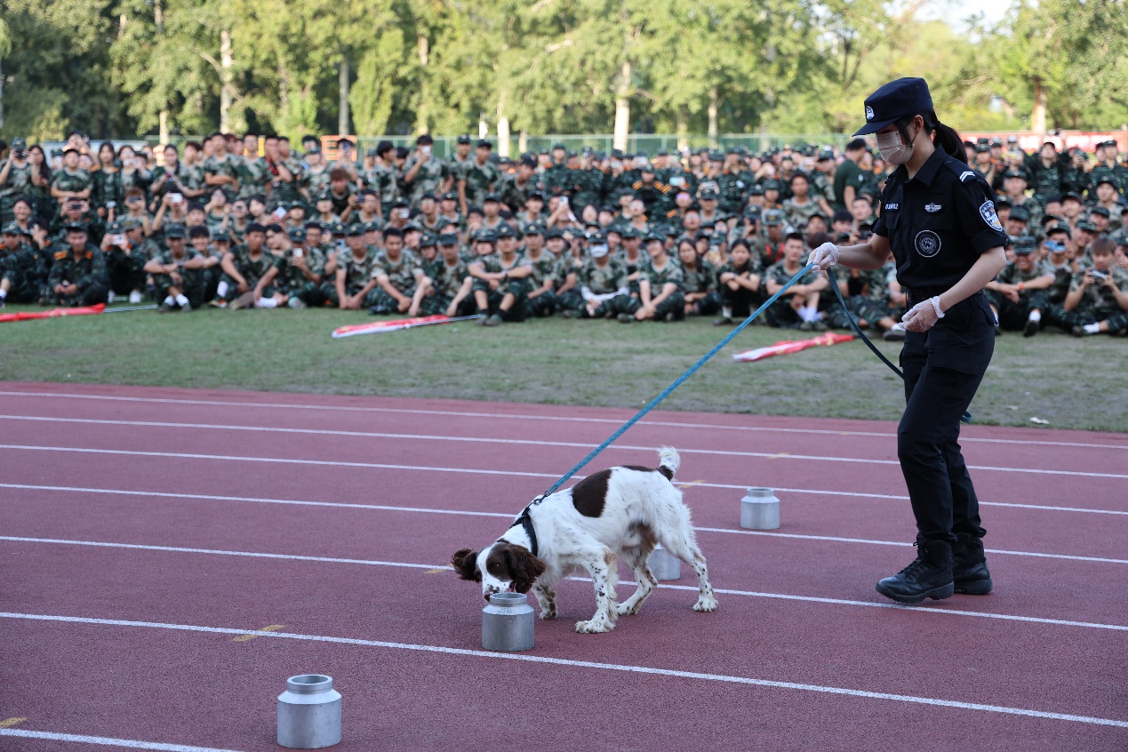 接下来,反恐支队民警为同学们表演了警犬搜寻暴恐物品,并讲解了反恐防爆应对知识,示范了防范技术,期间邀请同学上台,现场进行了演练。